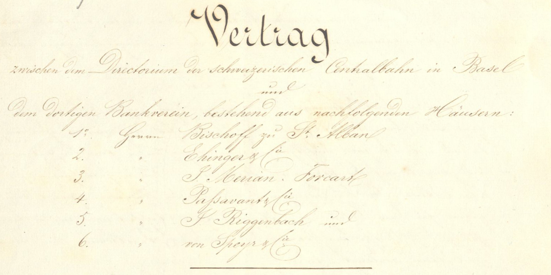 Ebenfalls in Paris wurde am selben Tag ein Vertrag mit acht Basler Bankhäusern unterschrieben, die sich zur Übernahme von 10'000 Aktien im Nominalwert von 5 Mio. Fr. verpflichteten, zu den gleichen Konditionen wie die Pariser Bankiers. Die acht Häuser waren Bischoff zu St. Alban, Ehinger & Cie., Ben. Laroche, Em. Laroche Sohn, J. Merian-Forcart, Passavant & Cie., J. Riggenbach und von Speyr & Cie.